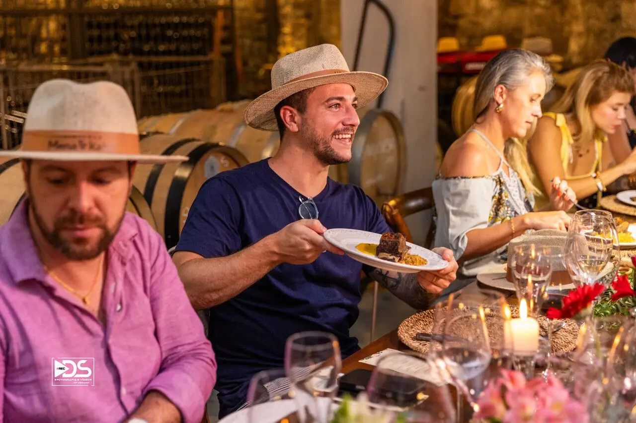 Então, a cave se torna cenário. À luz suave, entre pedra e madeira, acontece um jantar harmonizado de 5 passos, assinado pelo chef italiano Franco Gioeli e elaborado para dialogar com vinhos servidos diretamente da barrica, retirados no momento do serviço e decantados à mesa.